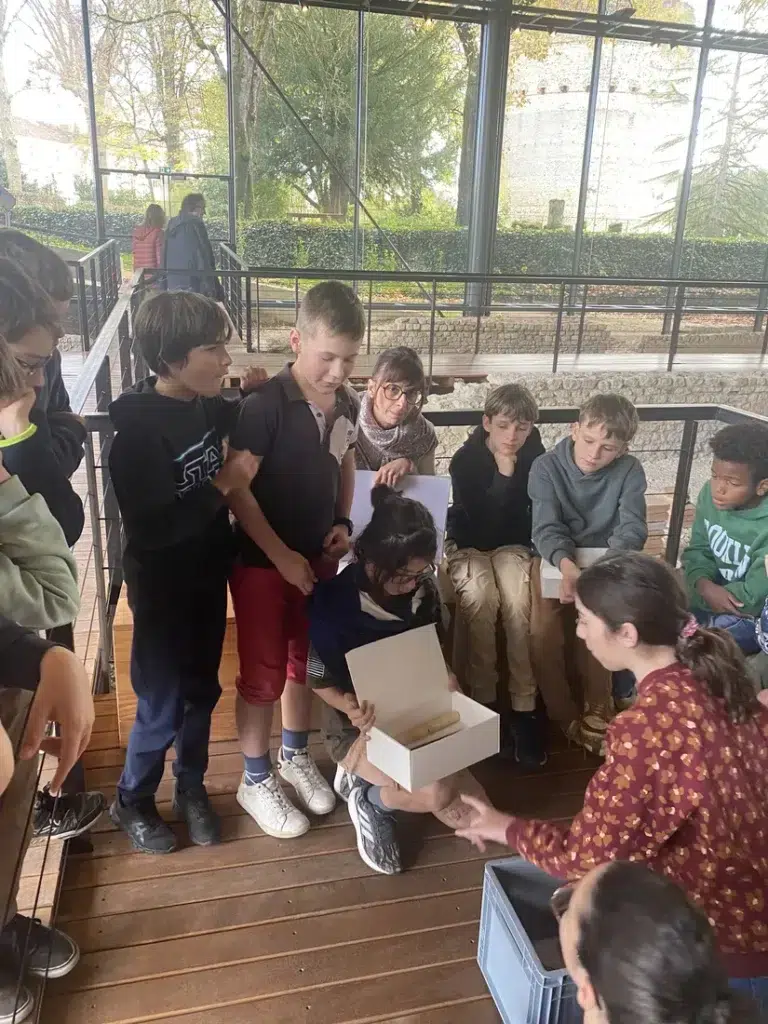 La matinée a débuté par la découverte du musée sous forme d’atelier. Par groupes, les élèves ont reçu un carton contenant des artefacts à identifier. Leur mission : retrouver dans le musée les objets correspondants, puis en présenter le nom, la matière et la fonction aux autres groupes. Un exercice d’observation, de rigueur et de déduction, qu’ils ont mené avec sérieux et enthousiasme.