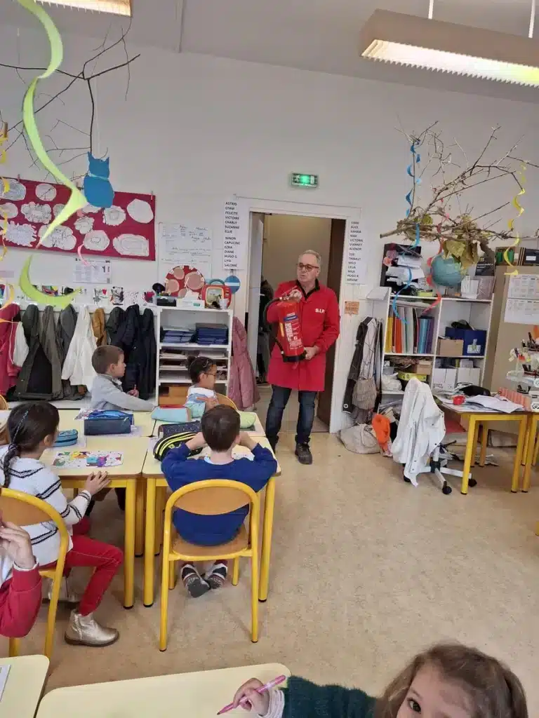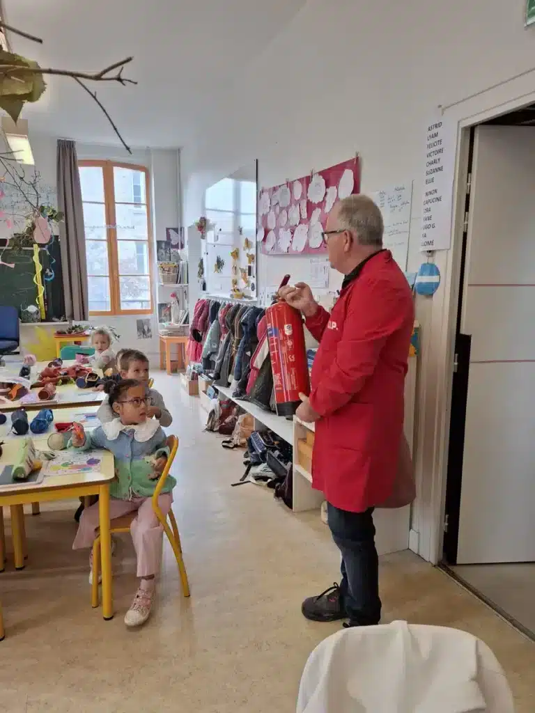Avant l’exercice incendie, ce lundi 29 septembre, les enfants de la classe de moyenne – grande sections de Notre Dame ont accueilli un professionnel des métiers de la sécurité. Ils ont pu ainsi avoir des explications sur l’extincteur, son fonctionnement et son usage.