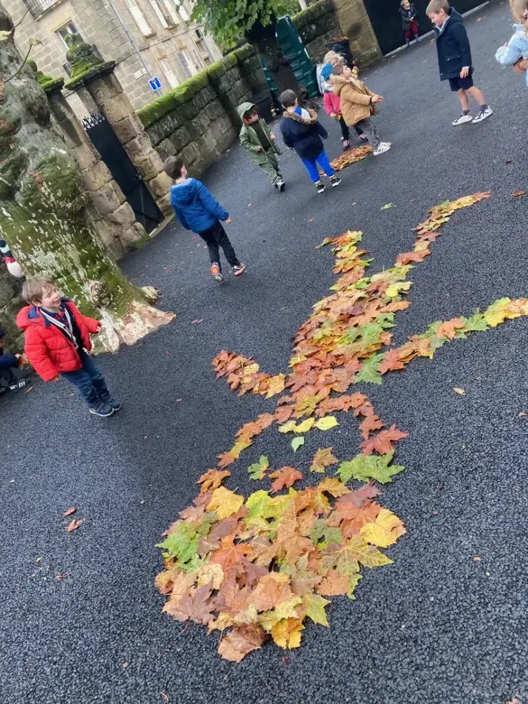 Sur la cour de l’École Notre Dame, lors de la pause méridienne, avec les élèves de maternelle, les jolies feuilles d’automne n’ont qu’à bien se tenir !!