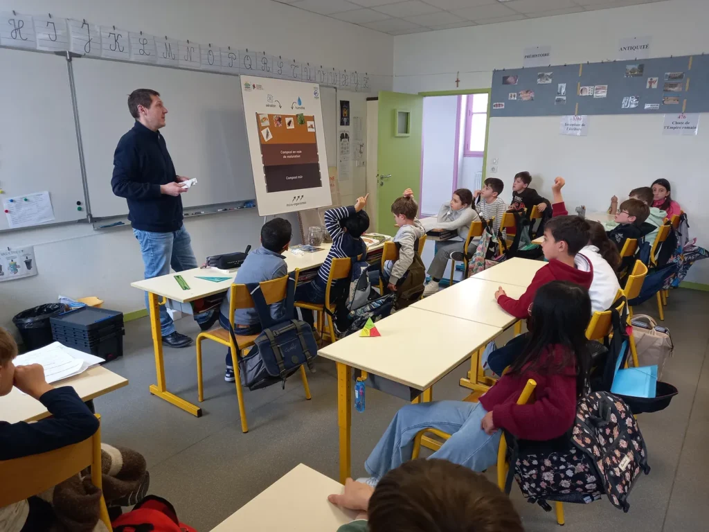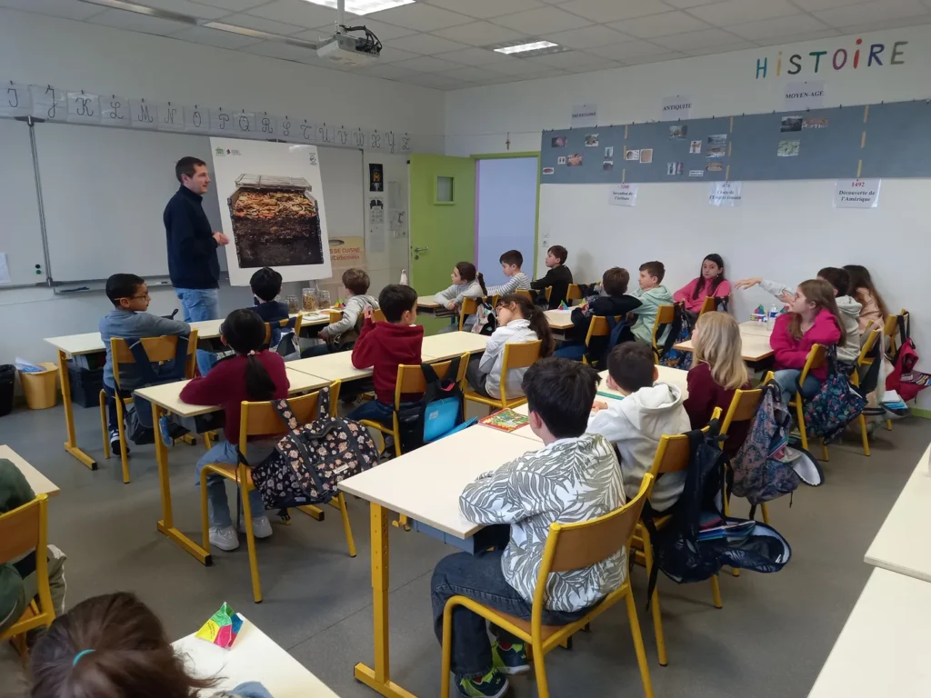 Monsieur Delmond, animateur au SIRTOM, est intervenu le lundi 16 mars, auprès des élèves de CE2-CM1 et de l’ensemble des éco délégués de l’école Jeanne d’Arc pour poursuivre la sensibilisation au tri des déchets ainsi que le suivi du compostage.
