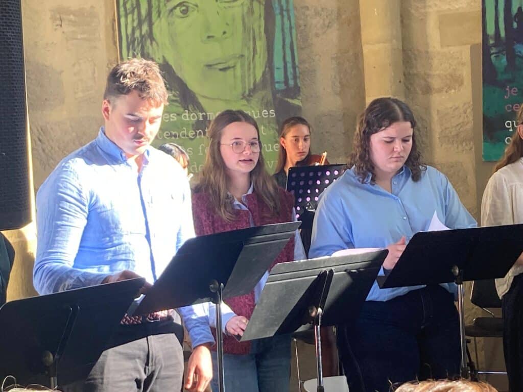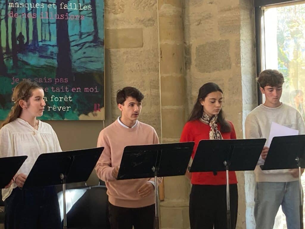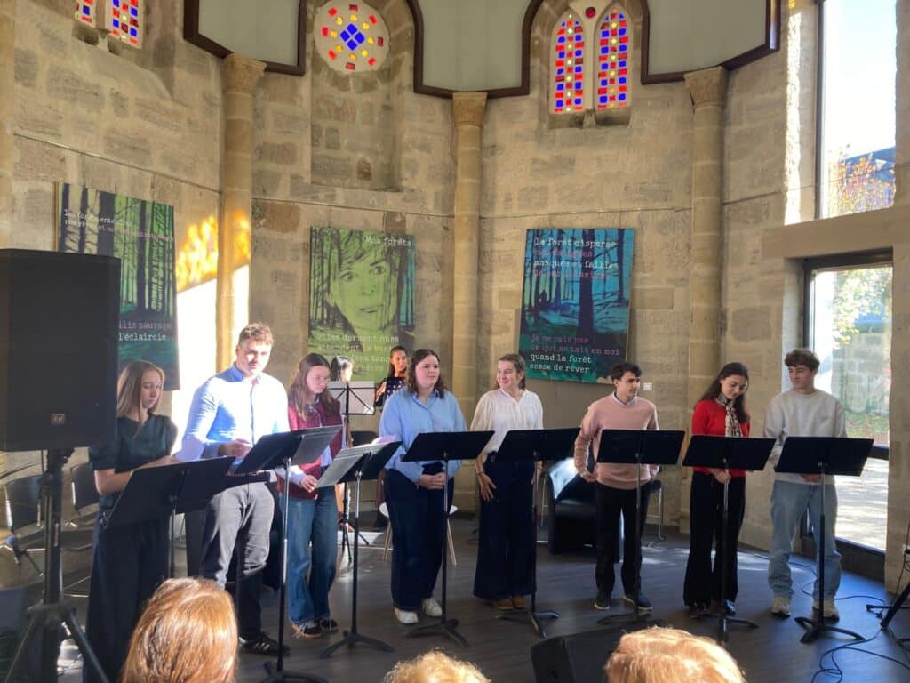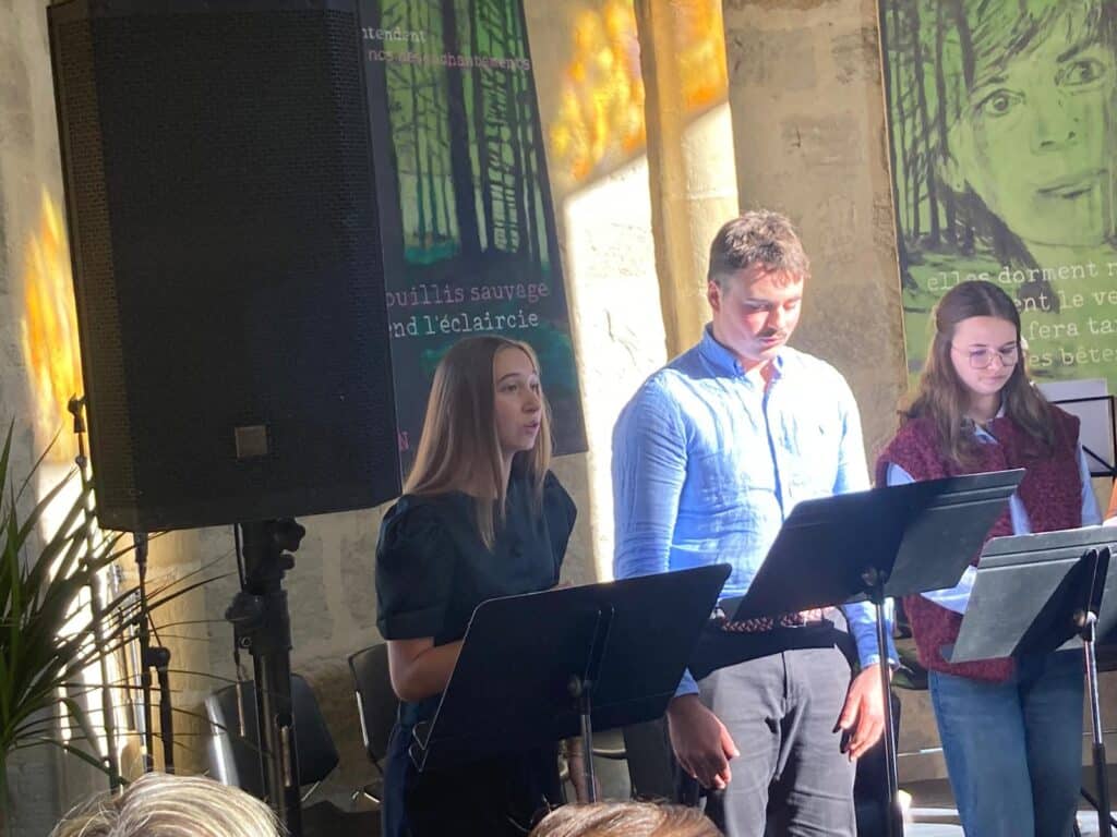 En hommage à son écriture et à sa réflexion sur le lien entre l’humain et la nature, des élèves de première et terminale option et spécialité théâtre ont rendu hommage à son univers poétique en mettant en voix des extraits de Mes forêts à l’Ouvroir, lors de la clôture de la Foire.
