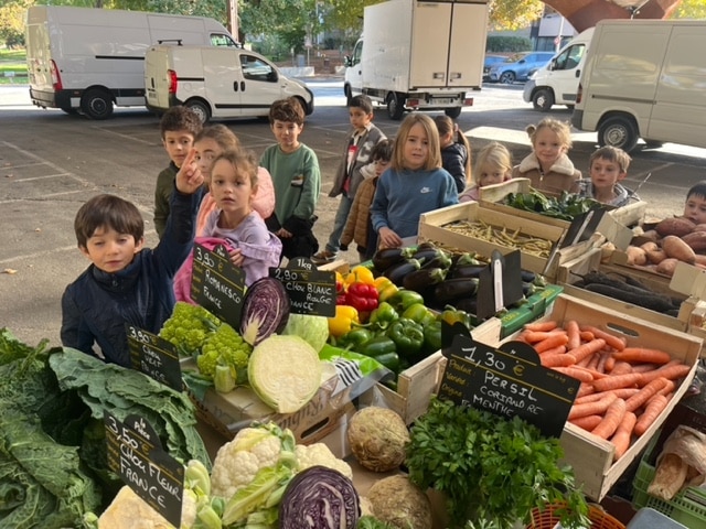 Le jeudi, la classe a poursuivi son exploration du goût lors d’une balade au marché. Les élèves se sont lancés dans une chasse aux fruits et légumes mystérieux, tout en échangeant avec les commerçants et en découvrant la diversité des produits locaux.